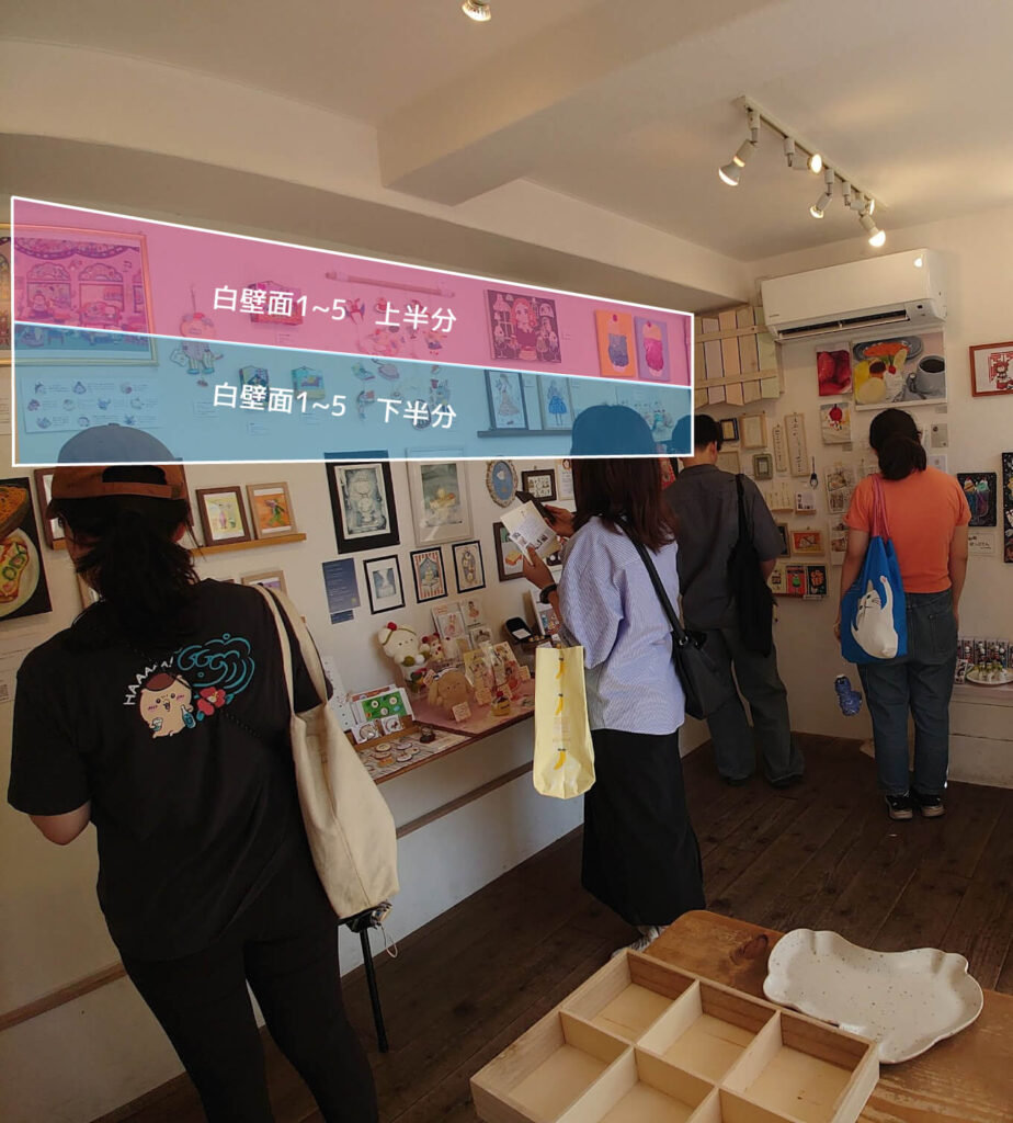 隣接する「B:ラック付き白壁面」に展示が重ならないようにご注意ください。