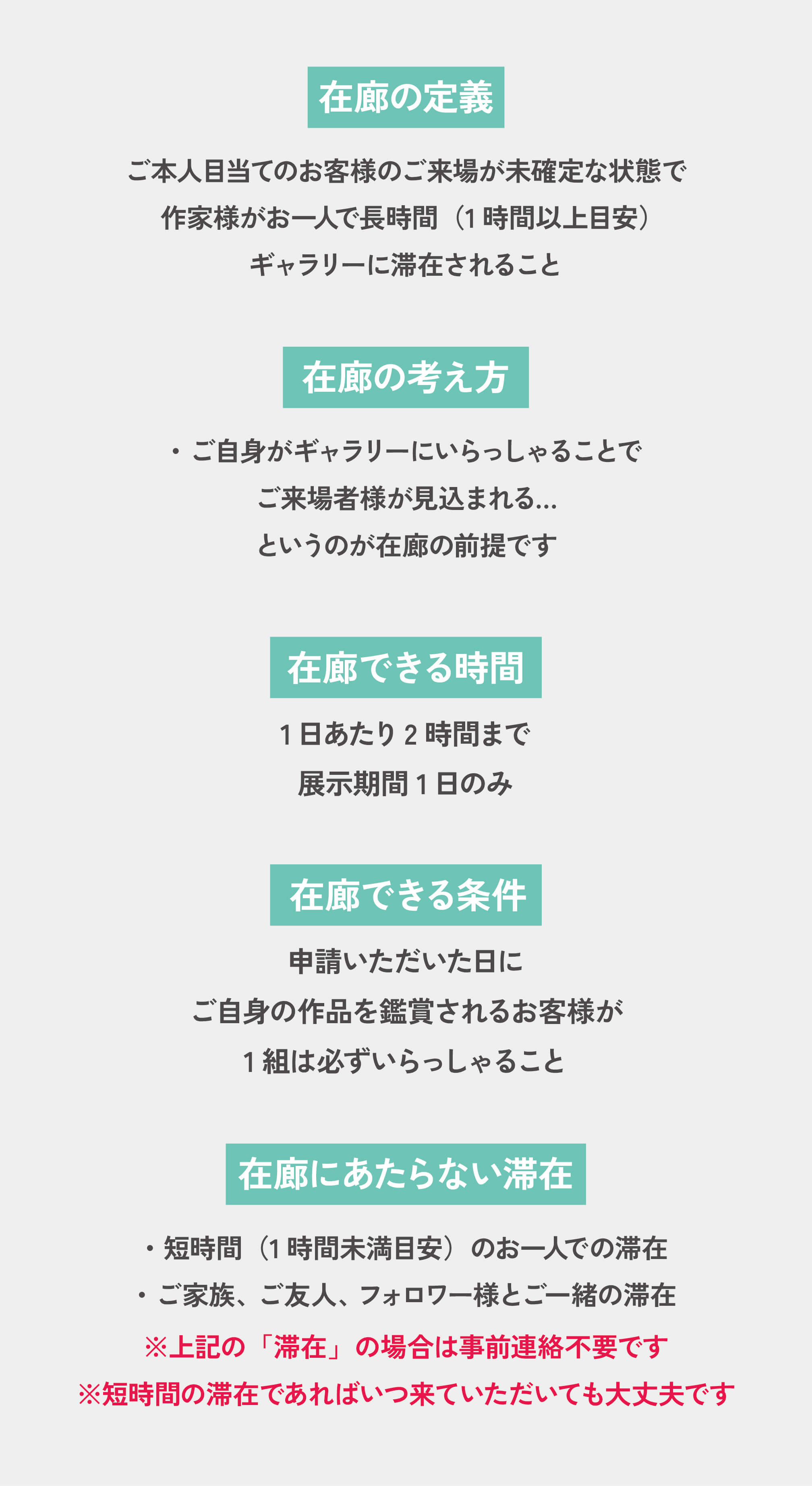 ギャラリーフィルモの企画展では、上記の通り、ご本人目当てのお客様のご来場が未確定な状態で、1時間以上作家様がお一人でギャラリーに滞在されることを「在廊」と定義しています。